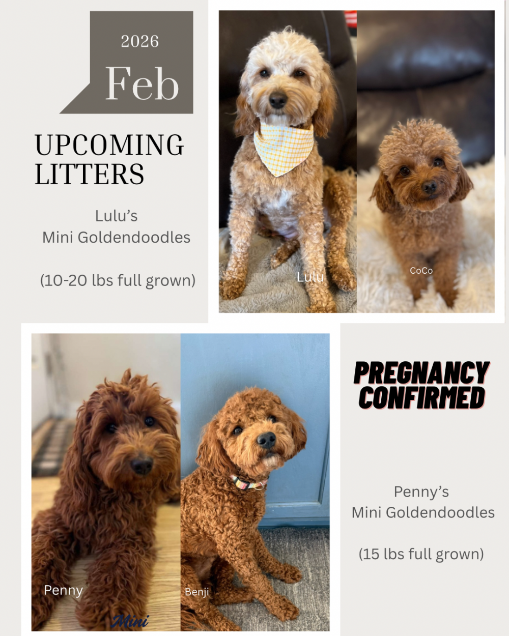 We're planing Mia's Medium/ Standard Goldendoodle litter in May/ June 2026.
