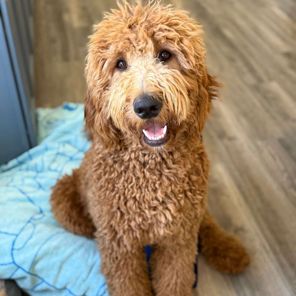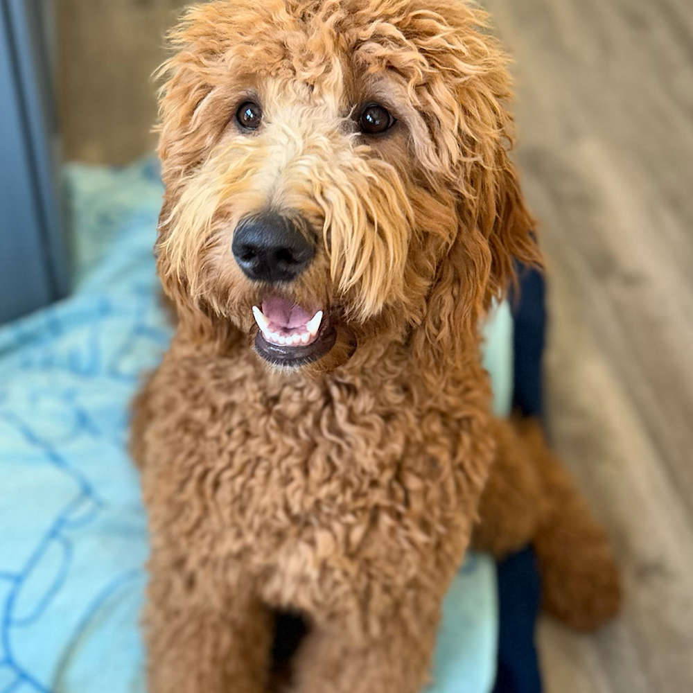 Brownie is an F1B Standard Golden Doodle who was born in our house. Her parents are Mia ( F1 Goldendoodle) and Mocha. ( AKC Standard Poodle) She is around 65 lbs and carries Intense Red and has a silky straight cost. She is a calm, gentle, and cuddle bug. She is DNA tested by Embark.