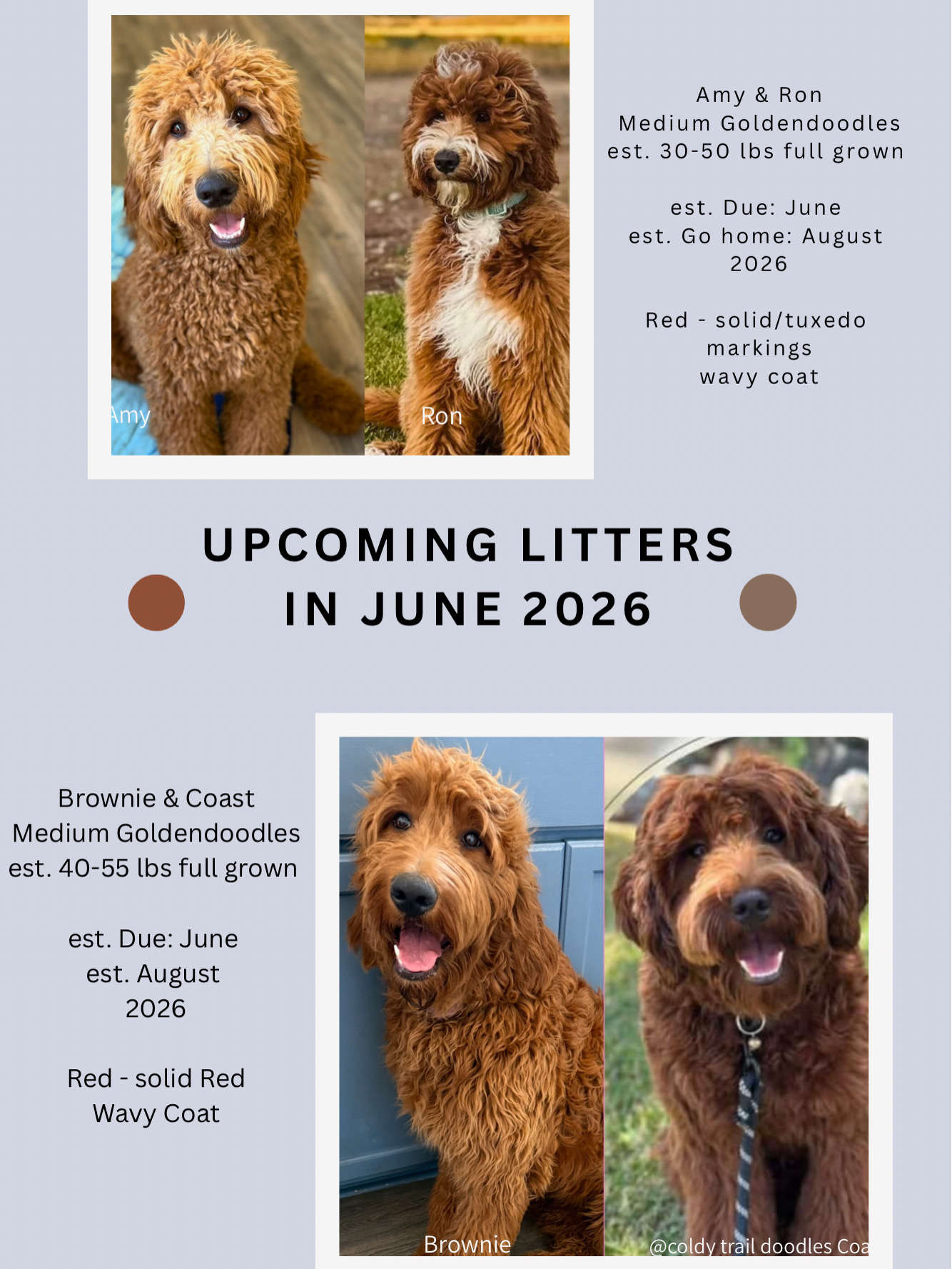• Brownie ( 64 lbs) & Coast ( 30 lbs ) Medium Goldendoodles in June 2026